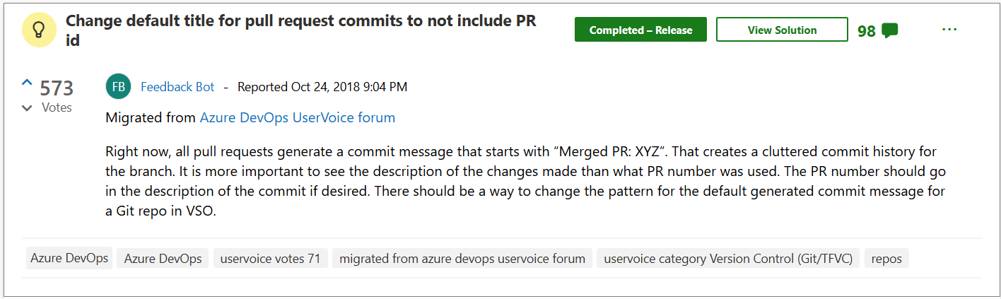 Feature request to disable or change the default commit message when merging a PR in Azure DevOps, created in 2018